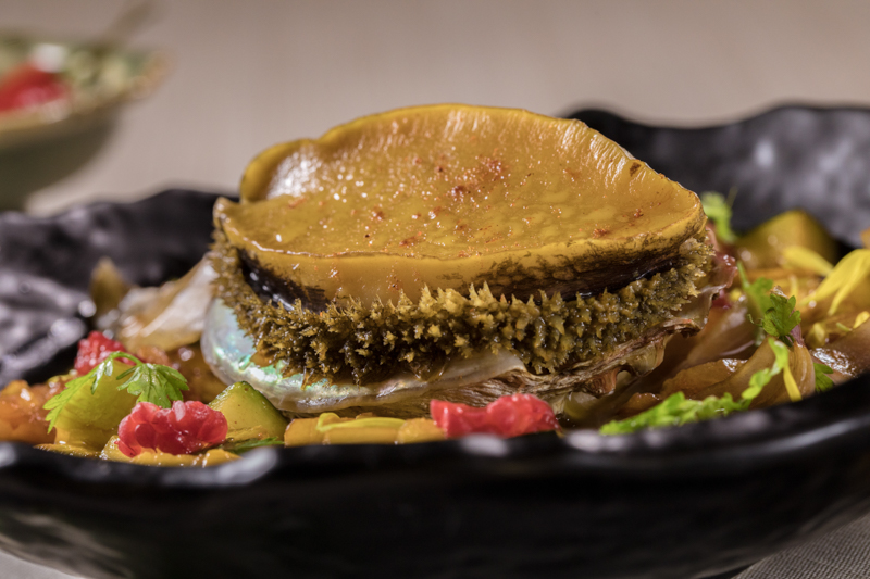 最後,從袋子中取出鮑魚,放在碟上,在每隻鮑魚上放蔬菜、珍珠,淋上鮑魚肝醬,以細葉芹和紅甜菜葉伴碟。
