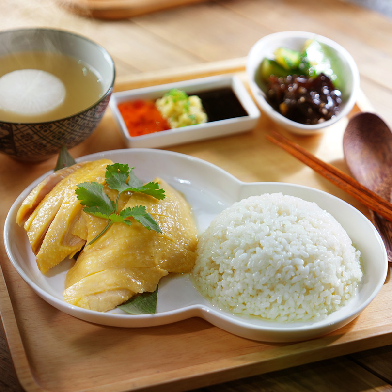 hainanese chicken rice set (w. soup & pickles)