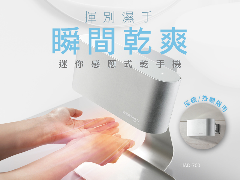 特別為您推薦全新迷你感應式乾手機 ( HAD-700 ),配備BLDC直流無刷度打產生強勁氣流配合600W功率製暖強勁暖風高效極速乾手,在保持雙手乾淨衛生之餘,有效避免細菌滋生,同時亦比抹手紙更環保,大大減少紙張浪費。