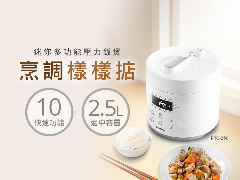 特別推出全新迷你多功能壓力飯煲 PRC-256,機仔細細,2.5L適中容量,一機有齊十種烹調功能,煮飯、煲粥、煲湯、燜燉樣樣掂,配合70kPa智能加壓,鎖住食材營養,烹調速度更比傳統電鍋省時逾60%,煮飯只需12分鐘,無論是忙碌上班族或注重方便快捷的年輕人,都能輕鬆享受到美味的家常滋味!