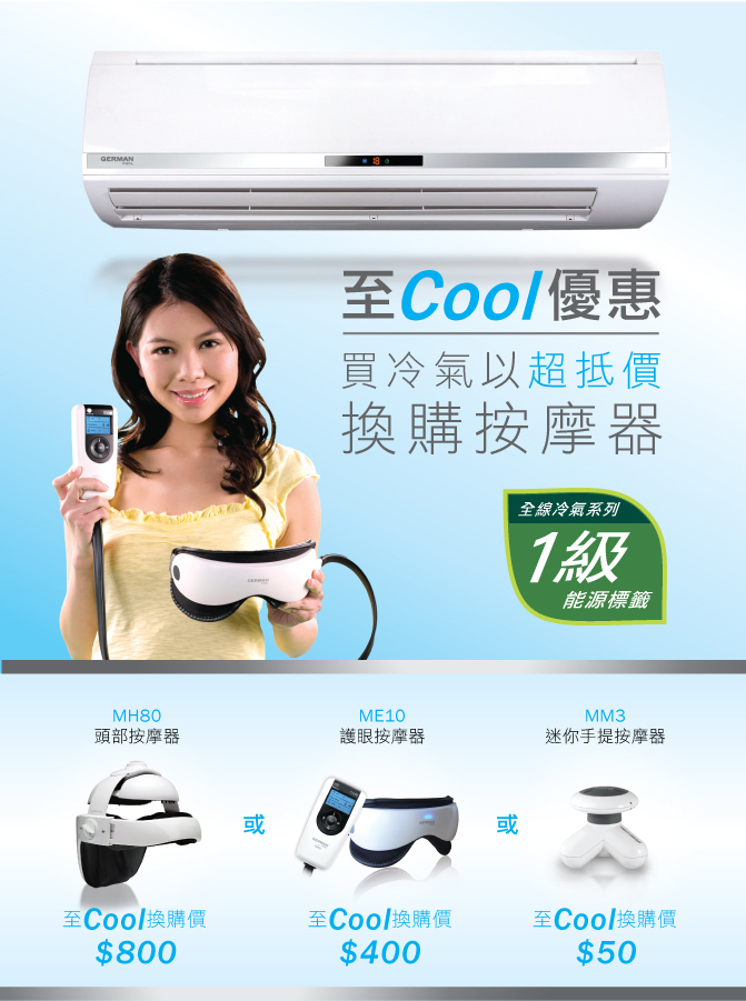 現凡選購指定德國寶冷氣機*,即可憑發票以超抵「至Cool價」換購頭部按摩器、護眼按摩器或迷你手提按摩器,實行一邊嘆冷氣,一邊享受舒適按摩,為炎夏送上至Cool感覺﹗