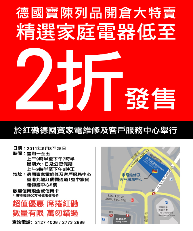德國寶將於2011年9月8至25日舉行「開倉大特賣」,多款精選家庭電器陳列品以低至2折價錢發售,震撼優惠只此一次,萬勿錯過﹗