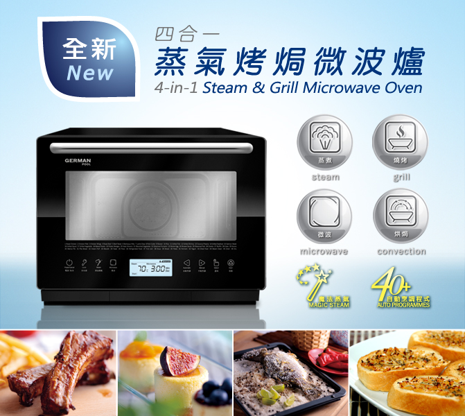 德國寶全新四合一蒸氣烤焗微波爐 MAG-280 突破傳統微波爐的限制,不單集蒸煮、燒烤、烘焗及微波四大功能於一身,更可讓用家自由配搭烹調程序,廚房裡有了它,便可以隨時炮製千變萬化的菜式,難怪大家都稱它 Magic Oven! Magic Oven 內置多種自動組合烹調功能同步組合烹調技術,令煮食效率大大提升,菜式更添滋味﹗