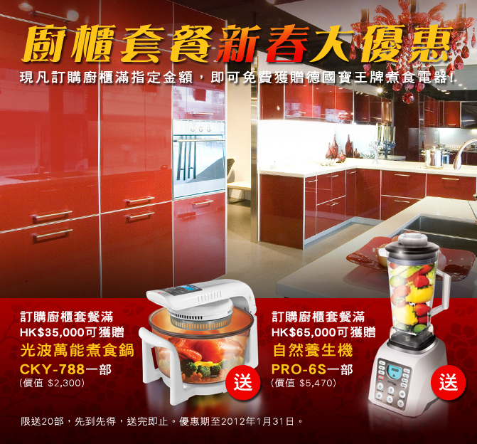 為慶祝新一年來臨,德國寶呈獻新春大優惠,購買廚櫃套餐滿指定金額,即送德國寶王牌煮食電器,限送20部,送完即止。優惠期由即日起至2012年1月31日,萬勿錯過!