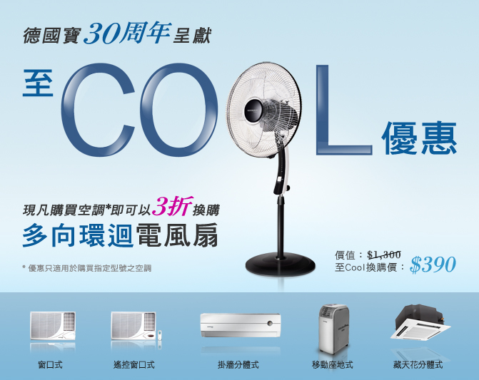 德國寶30周年呈獻「至COOL優惠」買空調3折換購多向環迴電風扇