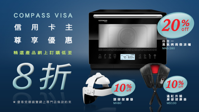 德國寶誠意為DBS Compass Visa信用卡會員精選產品,尊享折扣優惠,COMPASS VISA信用卡會員現凡於德國寶網上專門店 (E-STORE) 購買4合1蒸烤焗微波爐MAG-280、遠紅外線肩部按摩器MS100 或 頭部按摩器MH80,只需同時出示COMPASS VISA 優惠碼,即可額外獲得以下折扣:
