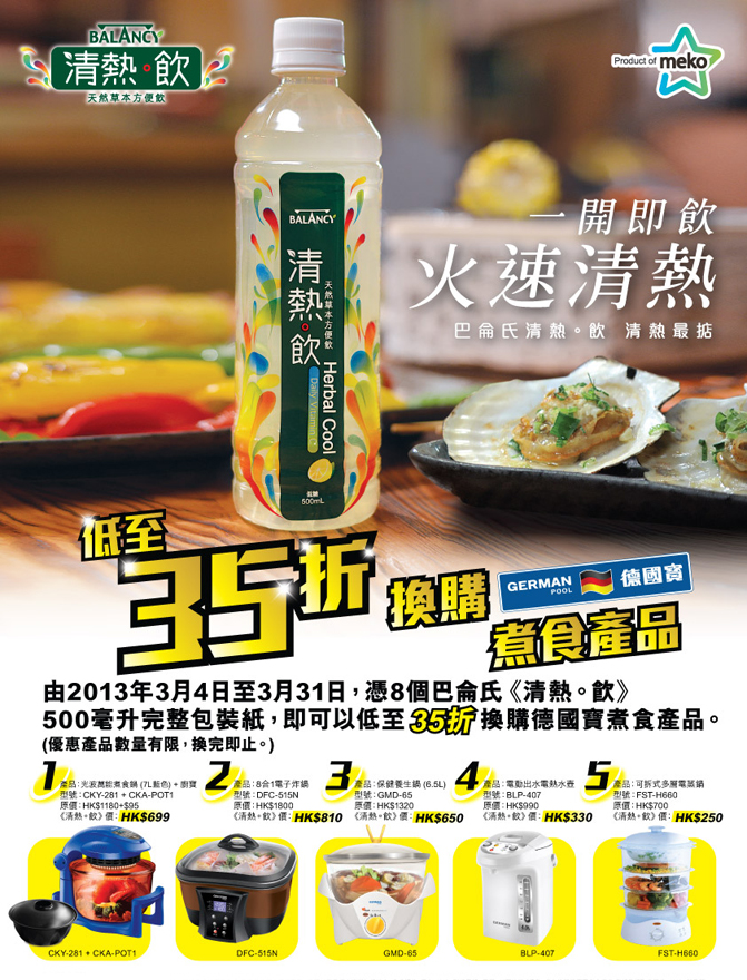 識飲識食的你,自然識揀品質超卓的德國寶生活電器。由2013年3月4日至3月31日,顧客凡於香港各大超市及便利店購買巴侖氏「清熱。飲」500毫升飲品8支,保留完整包裝紙,即可以低至35折換購精選德國寶生活電器,5款人氣之選包括: