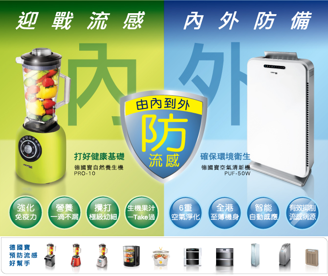 流感來勢洶洶,如何保障全家健康?德國寶一系列優質生活電器可以幫到你,一方面輕鬆簡單地自製天然防流感菜式,增強身體的抵抗力和免疫力;另一方面徹底清除家居環境中的潛藏病毒,殺滅外在的致病細菌。內強體魄、外除病菌,360度全面保護你和家人的健康。