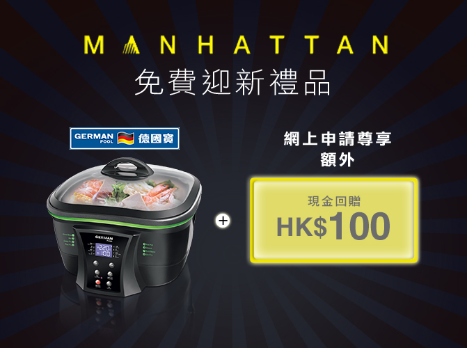 新客戶現凡成功於網上登記 MANHATTAN Platinum 信用卡,可享德國寶八寶鍋作為迎新禮遇。由即日起至10月31日,只需網上成功申請 MANHATTAN Visa 白金卡 / Platinum 萬事達卡 / Visa 金卡 / Titanium 萬事達卡主卡,及於新卡獲發出後首2個月內憑新批核之信用卡簽賬滿 HK$4,800或以上,即可得到德國寶8合1電子炸鍋乙個(價值:HK$1,080),更可額外得到 HK$100現金回贈。
