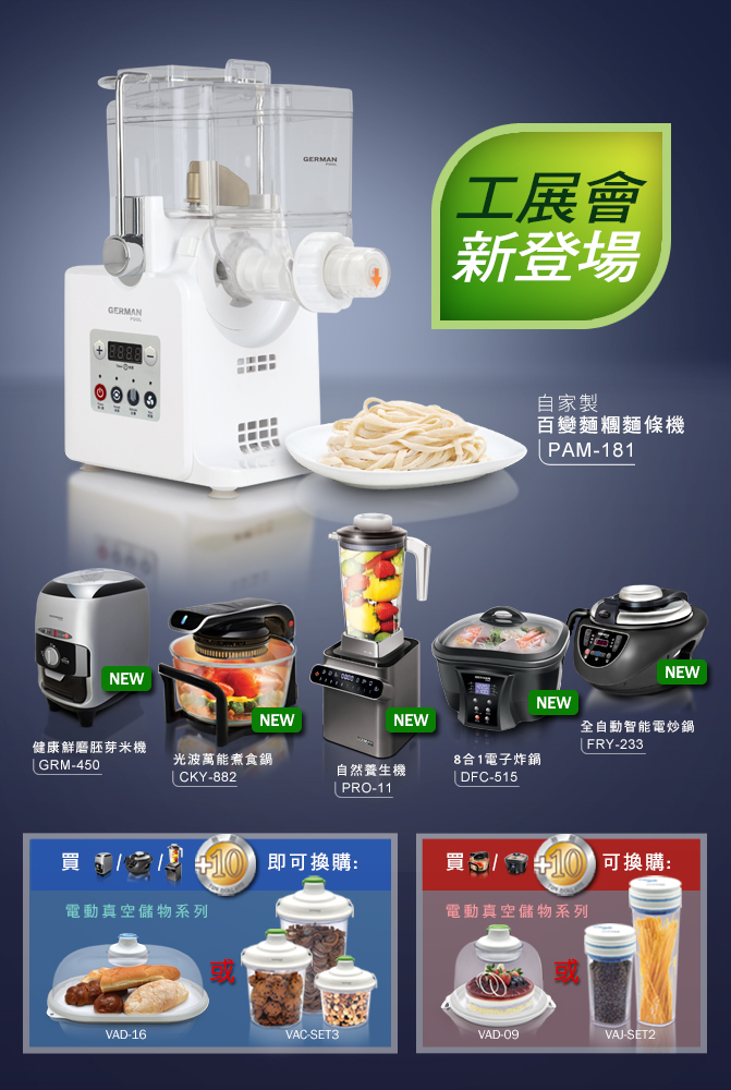 家電及廚櫃專家德國寶,一向致力推動健康養生飲食文化,將於第48屆工展會推出及預展超過20件2014年新產品,包括全自動智能電炒鍋、自家製百變麵糰麵條機、健康鮮磨胚芽米機、光波萬能煮食鍋、8合1電子炸鍋、遠紅外線按摩系列、無線蒸氣電熨斗、瀘芯瀘水壺、電子磅系列、即熱式熱水器CEX-21、超勁超靜抽油煙機、多功能浴室暖風乾衣機、不銹鋼壓力鍋系列,以及電動真空儲物系列,並推出「開心換購組合」及「「買得多」換購組合」等精彩優惠,回饋顧客。