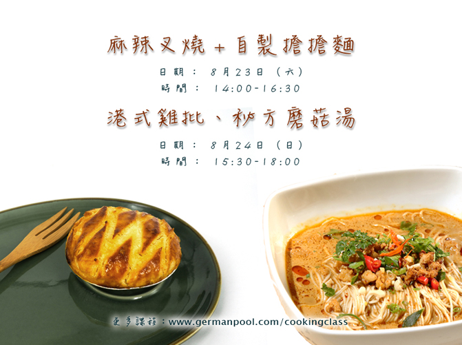 德國寶廚樂體驗館將於2014年8月23日 (星期六)與2014年8月24日 (星期日)舉辦互動實踐班,教授麻辣叉燒、手製擔擔麵與港式茶餐廳雞批、磨菇湯的製作方法。學員可親手試做各式麵條和濃湯,做出味道濃郁,辣味十足的美食。課程由【廚樂體驗館】經驗豐富既Vivian與Edmund導師教授,即日起接受網上報名,名額有限,先到先得!