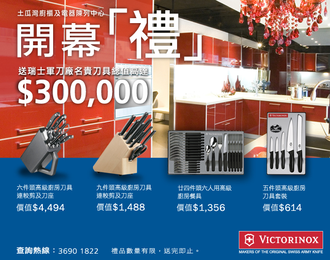 為慶祝德國寶土瓜灣廚櫃及電器陳列中心隆重開幕,由 2008 年 8月15日起至 10月15日期間,顧客凡于全新德國寶土瓜灣陳列中心購買德國寶廚櫃套餐滿港幣$29,999 或以上,或于指定商鋪*購買德國寶家庭電器產品滿港幣 $4,999 或以上 (可於壹個月內累積下列任何一間指定商舗之發票正本),即可免費獲贈德國寶開幕「禮」— 著名品牌 VICTORINOX 瑞士軍刀廠名貴刀具禮品壹份。開幕禮品總值高達港幣$30萬。數量有限,萬勿錯過﹗