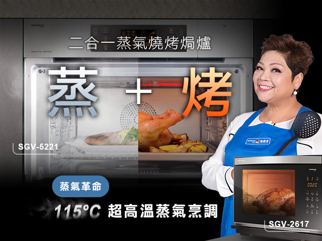 2合1蒸氣燒烤焗爐系列,亦具座檯式型號SGV-2613可供選擇。座檯式2合1蒸氣燒烤焗爐,同樣具超高溫蒸氣加熱技術及多種自動烹調功能,而且設計雅緻省位,適合香港家居小巧的廚房。兩種款式配合你的不同需要。