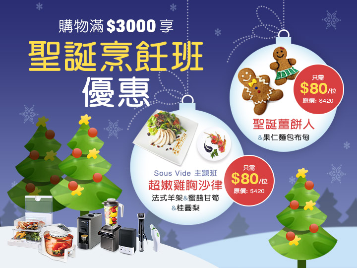 為迎接聖誕節,德國寶陳列室聯同廚樂體驗館推出12月至抵優惠,由即日至12月17日,凡於各大陳列室購物滿HK$3,000,即可以優惠價HK$80參加指定聖誕主題烹飪班(價值HK$420),名額有限,額滿即止,實在不容錯過!