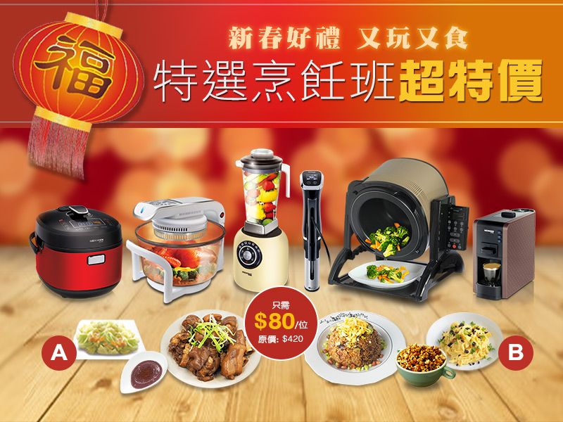 新春將至,德國寶陳列室聯同廚樂體驗館推出賀年優惠,由即日至2017年1月14日,凡於各大德國寶陳列室購物滿HK$3,000,即可以超級優惠價HK$80參加指定烹飪班(價值HK$420)。課堂上導師會指導學員親手製作各種賀年特色住家菜,新春宴客或作為家常小菜都毫不失禮。名額有限,額滿即止,實在不容錯過!