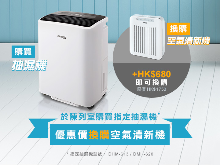 為迎接春天潮濕天氣的來臨,德國寶陳列室現推出限定抽濕機推廣優惠,由2017年2月16日起至3月31日,凡於各大陳列室購買型號DHM-613或DHM-620之抽濕機,即可以優惠價HK$680換購PUT-35空氣清新機乙部(原價: HK$1750)。產品數目有限,換完即止,實在不容錯過!