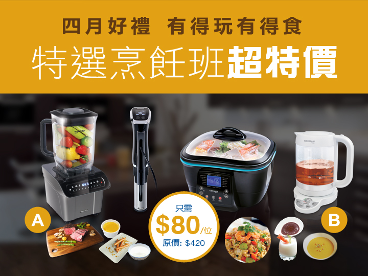 德國寶陳列室繼續聯同廚樂體驗館推出驚喜優惠,由即日至2017年4月24日,凡於各大德國寶陳列室購物滿HK$3,000,即可以超級優惠價HK$80參加指定烹飪班(價值HK$420)。課堂上導師會指導學員親手製作各種特色中西料理,宴客或作為家常小菜都毫不失禮。名額有限,額滿即止,實在不容錯過!