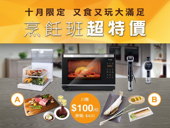 由即日起至10月28日,凡於德國寶陳列室購買物滿$4,000,即可以優惠價$100報讀烹飪班(原價$420),名額有限,欲報從速: