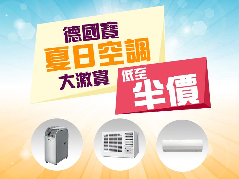 踏入五月炎夏將至,除電風扇以外,一部先進、實用又慳電的新款冷氣機可謂必不可少!為讓大家保持輕鬆自在、清凉度夏,德國寶旗下分體式冷暖空調系列、分體式淨冷空調系列、窗口式遙控空調系列、窗口式空調系列以及移動座地式冷暖空調系列的特選型號,現正進行超級激賞大優惠,在原有折扣上再打折,部分產品更以低至半價發售,以全城最優惠價錢為你提供最經濟實惠、優質耐用的冷氣產品!