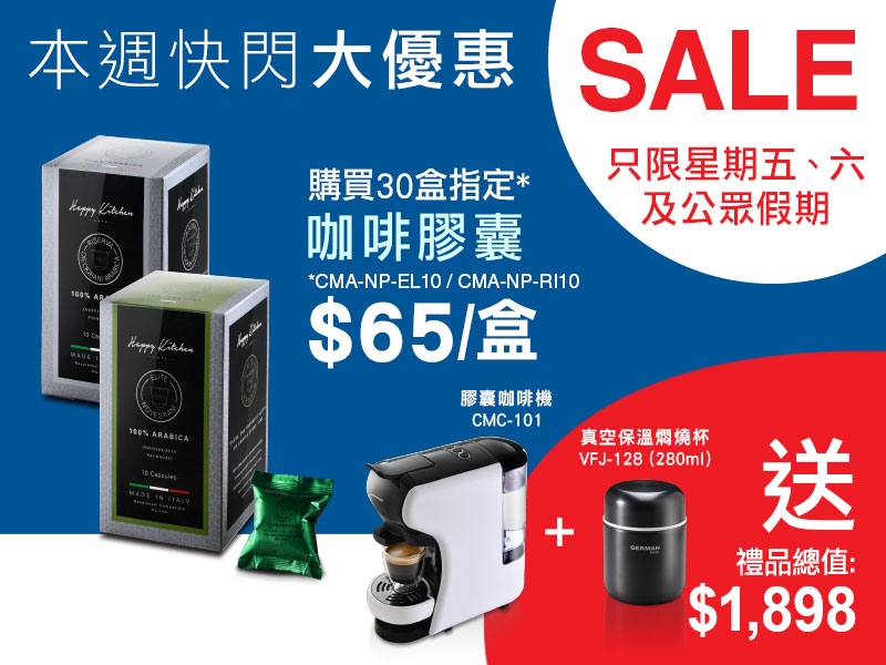 德國寶快閃優惠震撼登場!由8月16至18日期間(本週五、六、日)親臨九龍灣MegaBox廚櫃及電器陳列中心,購買30盒指定款式Happy Kitchen咖啡膠囊(CMA-NP-EL10 / CMA-NP-RI10),即送你膠囊咖啡機(CMC-101)及不銹鋼真空保溫燜燒杯(VFJ-128),禮品總值超過$1,800!數量有限,送完即止!