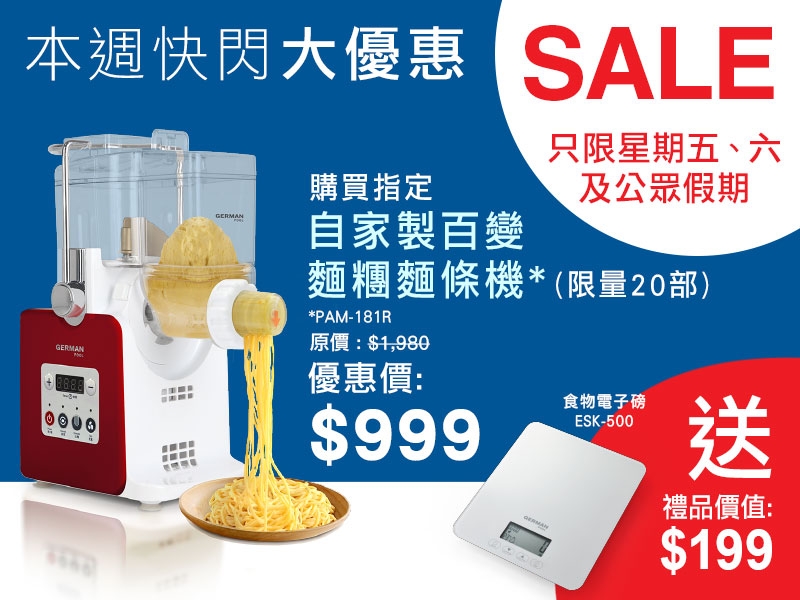 德國寶全新快閃優惠震撼登場!由8月30至9月1日期間(本週五、六、日)親臨九龍灣MegaBox廚櫃及電器陳列中心,即可以震撼價$999購買人氣產品——自家製百變麵糰麵條機(PAM-181R),限量20部,售完即止!更送你食物電子磅 (ESK-500),禮品價值$199!