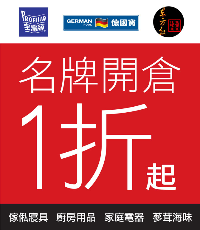 德國寶、寶富麗、東方紅三大名牌將於3月25至31日聯合開倉,家庭電器、廚房用品、傢俬寢具及蔘茸海味,售價低至1折。開倉產品涵蓋衣、食、住各個範疇,全數震撼低價發售,一件不留,萬勿錯過﹗