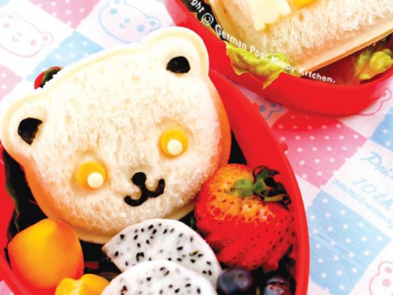 白麵包3片、麥包1片、牛油1/2茶匙、原味芝士片2片、車打芝士片1片、火腿1片、羅馬生菜2片、草莓1粒(洗淨)、火龍果2片、藍莓6粒(洗淨)、迷你杏桃1個(洗淨)、壽司紫菜1/2片、花生醬1/2湯匙、煉奶1茶匙