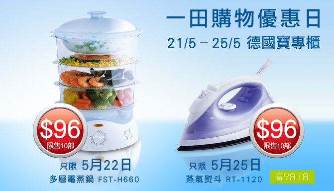 - 超級全能飯煲、保健養生鍋、多層電蒸鍋、二合一蒸氣燒烤焗爐、可攜式電磁爐及蒸氣熨斗一律以超級特惠價發售