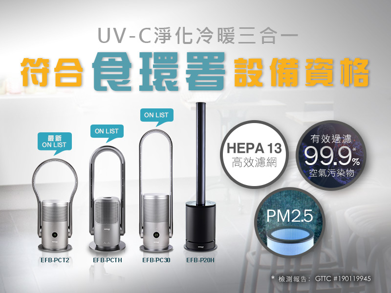 德國寶UV-C空氣淨化風扇暖風機(EFB-PCTH)及 UVC等離子空氣淨化風扇(EFB-PC30),以高效顆粒空氣過濾(HEPA)及先進紫外線C技術(UVC),多重殺滅空氣中的細菌病毒,完美合乎食環署專為餐廳食肆、飲食業界而設的措施,無論商用及家用,為清新無害空氣提供多一重保障!