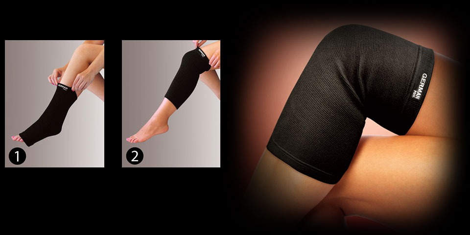 將膝套套於腳上(德國寶商標向外,塗有黑色遠紅外線能量點的一面向內),拉至蓋過膝蓋的位置。