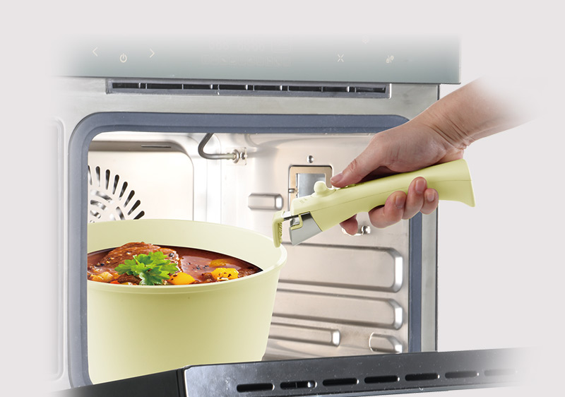 簡單一click,手柄立即裝拆,安全可靠,讓您輕鬆把鍋具從爐頭移動到焗爐內烹調,最後端上餐桌,原鍋上菜。