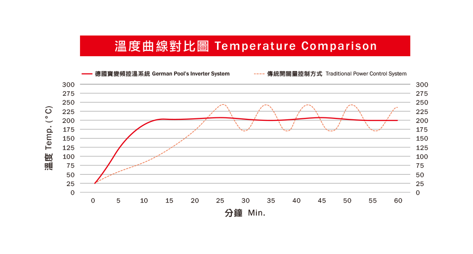 德國寶商業電磁爐具系列的變頻技術能調控、鎖定輸出功率,使其不受電壓的起伏影響,穩定火力,確保出品質素維持一致,同時 節省能源,降低營運成本。
