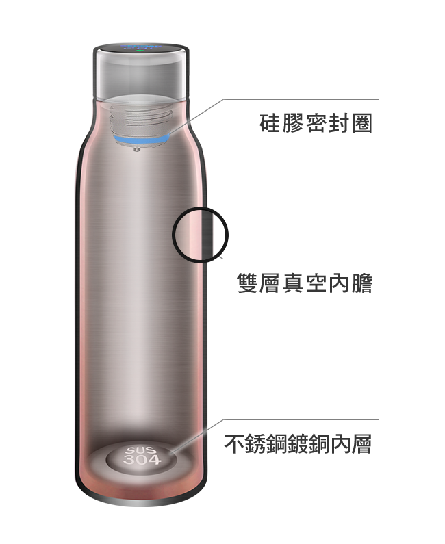 採用雙層真空不銹鋼內膽設計,配合不銹鋼鍍銅內層及硅膠密封圈,提供極佳密封性,以三重鎖溫技術阻止熱量流失,冷熱皆可,保溫效果一流。