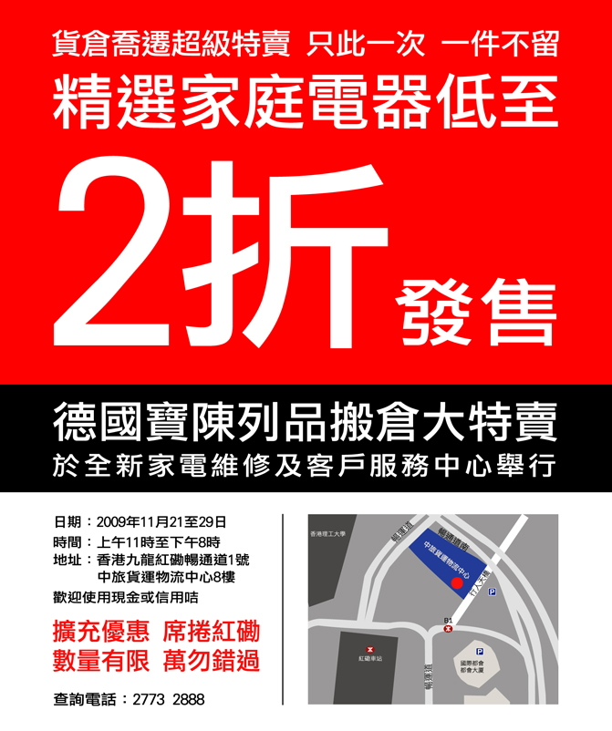 为庆祝德国宝家电维修及客户服务中心和仓管部扩充发展,德国宝将于11月21至29日举行「搬仓大特卖」,多款精选家庭电器以低至2折价钱发售,震撼优惠只此一次,万勿错过﹗