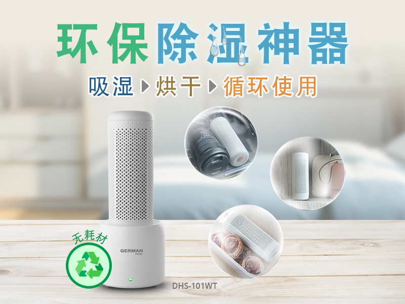 特别为您推荐全新物理环保除湿器 DHS-101WT,破革采用可循环使用设计,配备 100ml 大容量吸湿棒,当吸湿棒水份饱和后放回底座烘干即可再次吸湿,可循环使用超过 300 次*,环保首选!特别采用无水箱设计,水份紧锁于吸湿珠之内,避免任何渗漏、倒泻问题,极之方便易用!助您从此告别传统除湿盒,一枝解决衣柜潮湿问题!