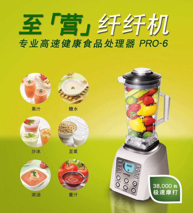 德国宝2010年重点推出全新产品 — 专业高速健康食品处理器 PRO-6 (又名「自然养生机」),以高达38,000转极速摩打,将整件蔬果连果肉、皮及籽一并细磨成汁,从而释出当中蕴含的植物生化素(Phytonutrients)及纤维,一滴不漏地让你吸收整件食物的营养,达到防病、抗老及纤体功效,如此细磨效果絶非一般低转速搅拌器所能做到﹗