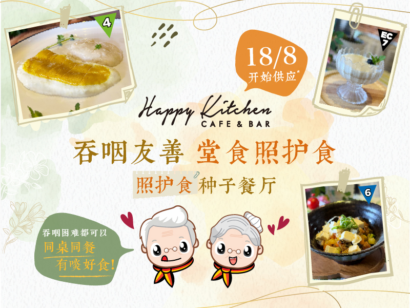 让有需要人士能与家人共享滋味,不再被孤立于饭桌之外,同餐同桌同食,一家人食得开心又安心!德国宝Happy Kitchen Café & Bar现已成为社联照护食种子餐厅,欢迎大家亲临品尝*!