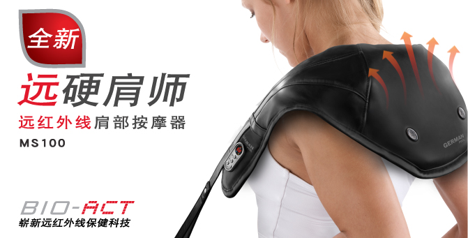 德国宝全新推出的远硬肩师结合远红外线与强效热疗功能:先以BIO-ACT「远」红外线舒缓肌肉,使肌肉微热进入准备按摩状态,然后透过强效热疗功能加热,再以两个「硬」力适中的按摩搥为你按摩,感觉犹如你的私人「肩师」(肩颈按摩师)一样,效果及舒适度均大大提升,可有效地促进血液循环,加速新陈代谢,有助放松及减轻肩、颈、腰、背、腿部等疲劳痛楚,使肌肉瞬间得到松弛,令你回复状态,神采飞扬。