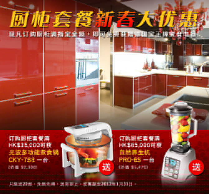 为庆祝新一年来临,德国宝呈献新春大优惠,购买厨柜套餐满指定金额,即送德国宝王牌煮食电器,限送20部,送完即止。优惠期由即日起至2012年1月31日,万勿错过!