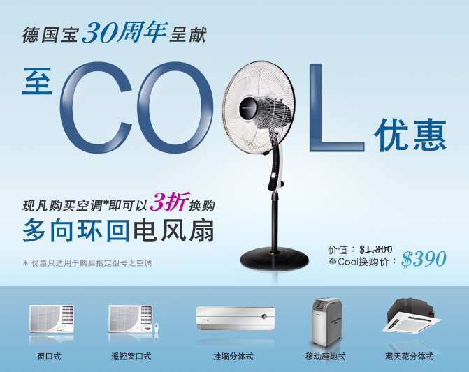 德国宝为庆祝30周年,特别呈献「至COOL优惠」— 现凡购买指定空调*,即可以3折超抵价换购「多向环回电风扇」EF-716F。空调配风扇,加速冷风循环,即使调高空调温度,仍可凉遍家中每个角落,省电环保。换购品数量有限,换完即止。请即亲临德国宝陈列中心及指定销售点尽享优惠﹗