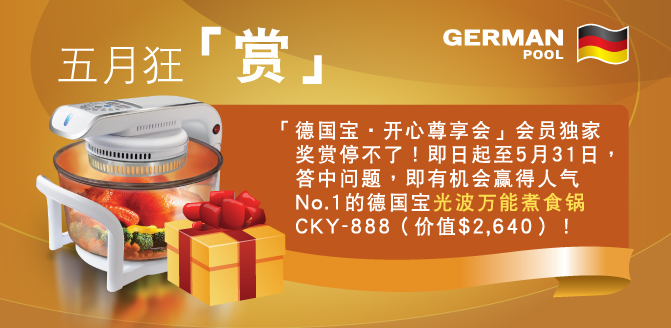 德国宝三十年来推出了无数质量卓越的家电产品,旗下的「德国宝‧开心尊享会」亦以带给会员源源不绝的独家优惠为宗旨。「德国宝‧开心尊享会」现特别呈献「五月狂赏」有奖游戏,送出人气No.1的华丽版光波万能煮食锅CKY-888(价值$2,640),想体验无火无油入厨新煮意的朋友勿失良机!