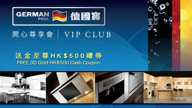德国宝2014年头炮优惠,除优质厨柜套餐外,由即日起至6月30日,凡加入德国宝.开心尊享会,并携同优惠券打印本亲临德国宝高级厨柜及电器陈列中心选用上门度呎及设计服务。首200名会员可获赠金至尊珠宝$500珠宝钻饰礼券*,凭券到金至尊门市选购各类正价珠宝钻饰作现金使用。双重优惠,不容错过!