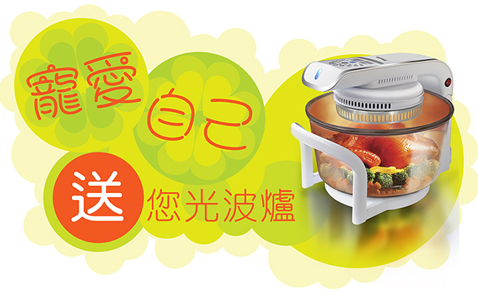 手作料理的风潮愈演愈烈,你是否也想过要亲自下厨大显身手呢?与大家一起分享你对自己的爱,对生活的热情,宠爱自己,赢取光波炉,将你的「杰作」POST 上 FACEBOOK 并 TAG 开心厨房,我们会根据最多的赞好(LIKE) 和分享 (SHARE) 人数,及创意等级选出得奖者一名。