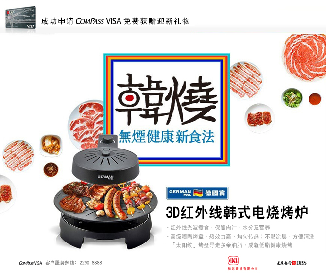 由即日起至2015年4月30日,凡成功申请COMPASS VISA白金卡的客户,即可选择免费获赠德国宝全新韩式光波烧烤炉KQB-215乙部(原价:$1680),优先享受低脂、健康的烧烤乐趣!数量有限,送完即止。