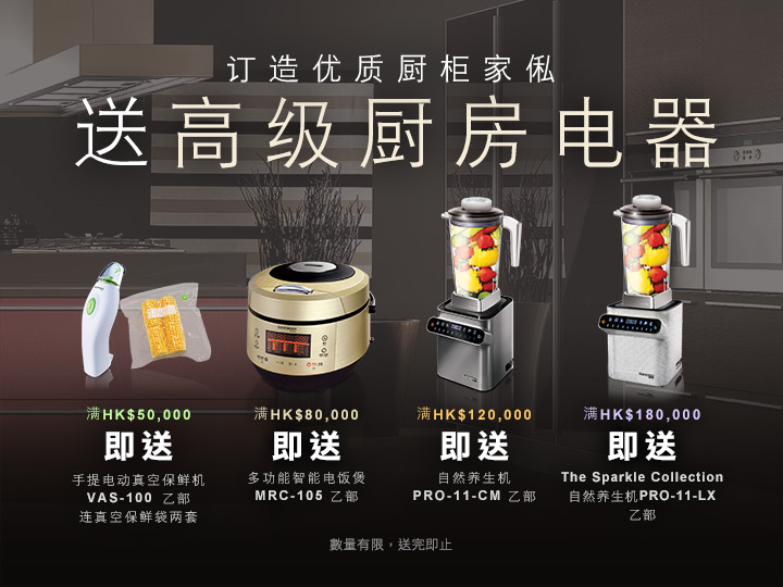 购买厨柜家私系列产品折实后满 HK $50,000,即送手提电动真空保鲜机 VAS-100 乙部连真空保鲜袋两套(价值 HK $520);折实后满 HK $ 80,000,即送多功能智能电饭煲MRC-105乙部(价值 HK $1,380);折实后满 HK $ 120,000,即送自然养生机 PRO-11-CM 乙部(价值 HK $3,980);折实后买满 HK $ 180,000,则送The Sparkle Collection 自然养生机 PRO-11-LX 乙部(价值 HK $ 33,000),数量有限,送完即止。