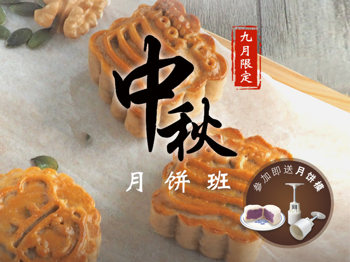 中秋月饼班有多种月饼款式可供选择,包括五仁叉烧月饼、冲绳黑糖紫薯月饼、冰皮月饼、传统蛋黄莲蓉月饼及潮州香芋酥皮月饼。凡报读9月份月饼班,更可免费获赠月饼模一套,不容错过!