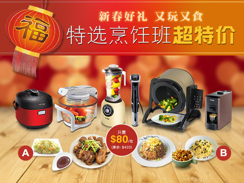 新春将至,德国宝陈列室联同厨乐体验馆推出贺年优惠,由即日至2017年1月14日,凡于各大德国宝陈列室购物满HK$3,000,即可以超级优惠价HK$80参加指定烹饪班(价值HK$420)。课堂上导师会指导学员亲手制作各种贺年特色住家菜,新春宴客或作为家常小菜都毫不失礼。名额有限,额满即止,实在不容错过!