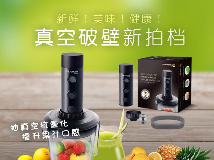 德国宝再创果汁新潮流,让果汁长效保持新鲜的“不老”秘密—真空破壁。只需简单配合养生机真空抗氧机及自然养生机,就能让营养美味全面升级,有效抗氧化,延长保鲜期,让果汁色泽更鲜艳、口感更顺滑、味道更浓郁!保存更多维他命和多酚等营养元素,有效延缓衰老,带来前所未有的健康新体验。