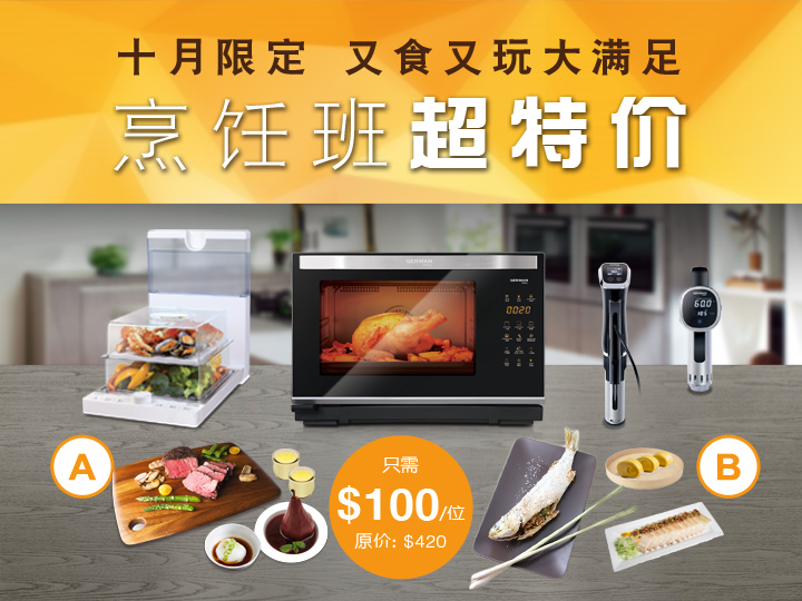 施展入厨技术和创意,家常菜都可以煮出大师级味道!德国宝推出层出不穷的煮食小电器之余,每月亦设有烹饪课程,10月将会精选中西全餐各一,以优惠价$100招生。中式蒸焗有何技巧?法式真空慢煮(sous vide)有何奥妙?你有机会用德国宝产品实战!