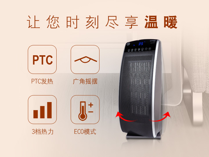 不止是如此,在智能变频ECO模式下,暖风机的智能自检程序能将设定温度与环境室温进行比较,自动变频,选择最合适的功率进行加热,确保室内舒适同时,还能避免消耗多余的电力,减少能耗。